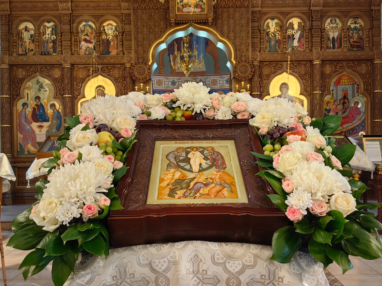 По завершении праздничной Божественной литургии был совершен чин освящения плодов нового урожая, после чего приношения прихожан были окроплены святой водой.